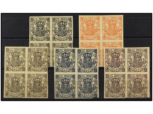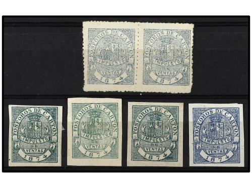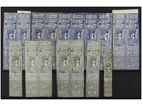 * ESPAÑA: FISCALES. FÓSFOROS. IMPUESTO DE GUERRA, 1874. Diez sellos en azul, siete en negro. Al. 9/10 .