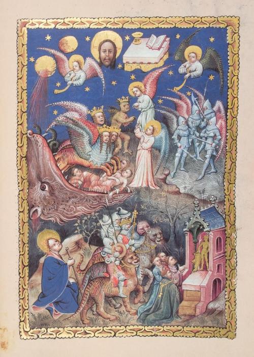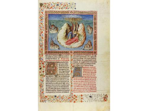 2004. LIBRO. (FACSÍMIL). APOCALIPSIS FLAMENCO. Barcelona: Ed. Moleiro, 2004. Folio mayor. 23 p. iluminadas. Enc. en plena piel. Nervios. Lomo cuajado. Ruedas en los cantos y en las cejas. Filetes en los planos. Presentado en un estuche de piel también con nervios y filetes en los planos. Edición de 987 ejemplares numerados con acta notarial. Facsímil de este poco usual Apocalipsis cuyo original se conserva en la Bibliothèque Nationale de France. Incorpora elementos iconográficos poco comunes en este tipo de códices pertenecientes al período previo a Van Eyck. Con el libro de comentarios.
