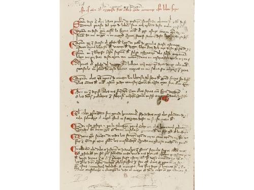 1996. LIBRO. (FACSÍMIL). LIBRO DE HORAS DE LA REINA MARIA DE NAVARRA. Barcelona: M. Moleiro Editor, 1996. 8º. Volumen de facsímil enc. en plena piel, nervios, florones, ruedas doradas en ambos planos, cortes dorados, ruedas doradas en las cejas, presentado en un elegante estuche en piel, con leves marquitas en los planos. Perfecto estado de conservación, con certificado notarial. Edición numerada de 987 ejemplares. El Libro de horas de María de Navarra fue confeccionado en la época de florecimiento y desarrollo de los libros de horas, cuya difusión se vio impulsada por el deseo de los seglares de poseer un libro de rezo. Se acompaña del libro de estudios, levemente rozado.