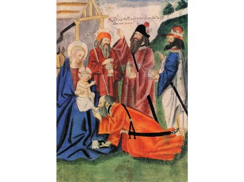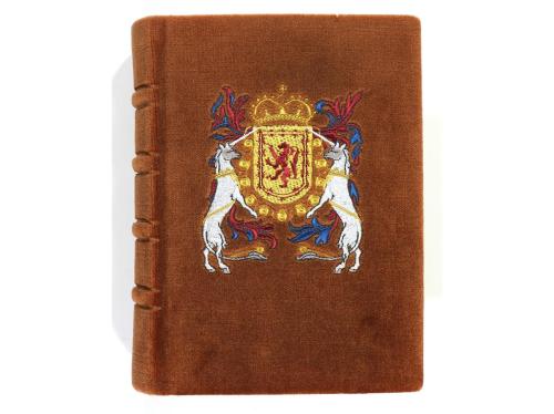 1997. LIBRO. (FACSÍMIL). LIBRO DE HORAS DE JACOBO IV. Madrid: Ed. Casariego, 1997. 8º mayor. Edicón facsímil del original custodiado en la Biblioteca Nacional de Austria con la signatura M 1897. Más de 180 h. con la reproducción sobre papel imitación pergamino, de las miniaturas bellamente coloreadas y el texto en caligrafía gótica. Enc. en terciopelo con bordado de escudo flanqueado por dos unicornios, en el plano anterior. Se acompaña del libro de estudio y ambos presentados en petaca de tela y cartoné. Con justificación del tiraje que acredita 125 ejemplares.