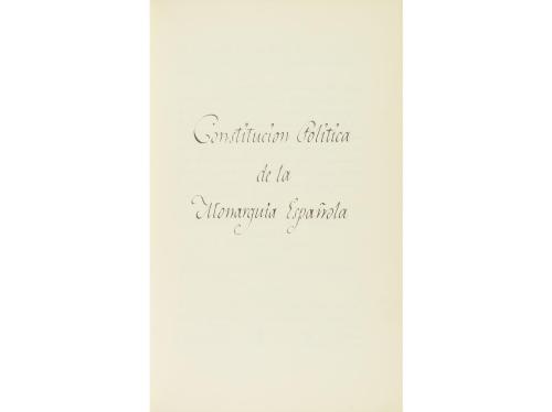 1985. LIBRO. (FASÍMIL). CONSTITUCION POLITICA DE LA MONARQUIA ESPAÑOLA. Madrid: Edilán, 1985. Folio mayor. Reproducción del manuscrito original elaborado por las Cortes de Cádiz en 1812 y conservado en el archivo del Congreso de los Diputados. Edición de 2000 ejemplares. Enc. en terciopelo granate, con cinta, alguna leve marca en los planos.