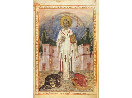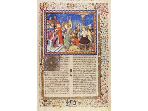 1997. LIBRO. (FACSÍMIL). EL MARTIROLOGIO DE USUARDO. Barcelona: Moleiro, 1997. Folio. Volumen de facsímil enc. en plena piel, nervios, ruedas doradas en ambos planos, presentado en estuche de piel. Se acompaña del volumen de estudio. Edición numerada de 987 ejemplares, con acta notarial. Este manuscrito ocupa un lugar clave en la historia de la pintura centroeuropea. Martirologio de Usuardo recorrió una larga trayectoria antes de llegar a Girona, su actual ubicación. Su origen es Praga, en la corte del rey de Bohemia y emperador Wenceslao IV, de donde pasó a Austria, Moravia y Hungría, Roma e incluso Madrid. Es considerada unánimemente la obra más fastuosa del gótico internacional.