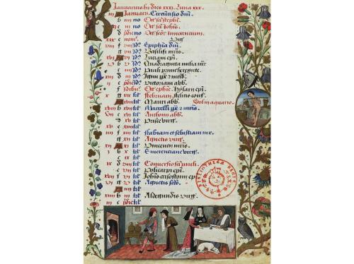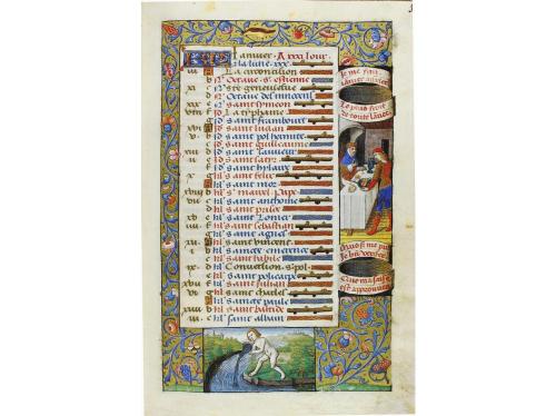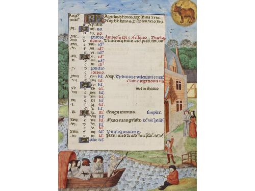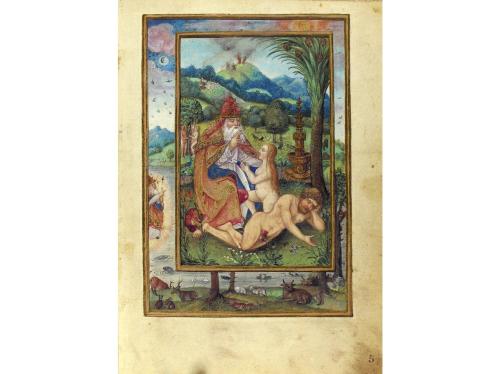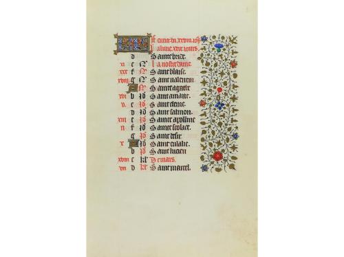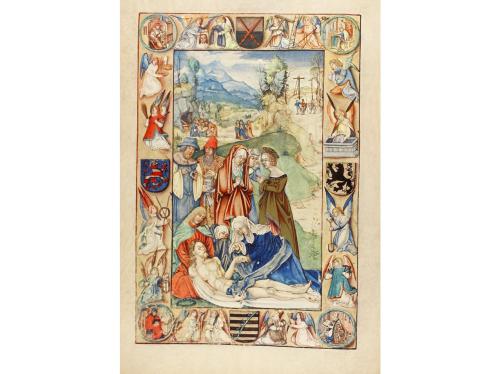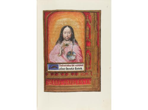 1995. LIBRO. (FACSÍMIL). LIBRO DE HORAS DE CARLOS VIII REY DE FRANCIA. Barcelona: Ed. Moleiro, 1995. 4º. 112 fol. iluminados. Enc. piel con dorados en ambos planos, nervios, lomera cuajada, cortes dorados y cierres metálicos. Presentado en un estuche de terciopelo. Edición numerada limitada a 987 ejemplares con acta notarial. Jacques de Besançon es el autor de las miniaturas de este libro de horas con más de 200 decoraciones vegetales en los márgenes y 190 escenas con motivos del antiguo y nuevo testamento, de la vida de la Virgen y, ocasionalmente, escenas militares.