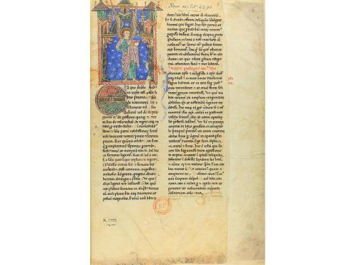 2006. LIBRO. (FACSÍMIL). APOCALIPSIS 1313. Barcelona: Ed. Moleiro, 2006. 4º. Aprox. 80 hojas imitación pergamino con la reproducción facsimilar del original que se encuentra en la Bibliothèque Nationale de France, con la signatura Fr. 13096. Enc. en pergamino rígido. Presentado en un estuche de piel con ruedas doradas en los planos, pequeñísima rozadura. Edición numerada, limitada a 987 ejemplares, con acta notarial. Sin el libro de estudios.