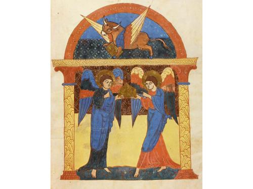 1980. LIBRO. (FACSÍMIL). APOCALIPSIS FIGURADO DE LOS DUQUES DE SABOYA. Madrid: Edilan, 1980. Folio mayor. Edición facsímil del códice escurialense Vit. I del Apocalipsis figurado de los duques de Saboya. Profus. ilustr., abundantes dorados. Enc. en plena piel, planos decorados dorados, cortes pintados. Cantos levemente rozados y lomera ligeramente descolorida. Presentado en una petaca con el libro de estudio. Edición de 1.000 ejemplares numerados, con acta notarial.