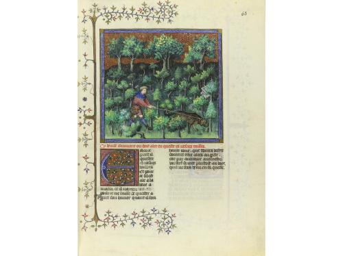 2017. LIBRO. (FACSÍMIL). LIVRE DE CHASSE. Barcelona: Ed. Moleiro, 2017. Folio mayor. Unas 200 hh. con la reproducción del manuscrito custodiado en la Biblioteca Nacional de Francia. Enc. en plena piel, con hierros dorados y secos en ambos planos, cantos y ruedas, guardas de piel repujada, cortes dorados, presentado en una elegante petaca de piel repujada. Acompañado por un grueso vol. de estudio. Edición numerada de 897 ejemplares, con acta notarial.