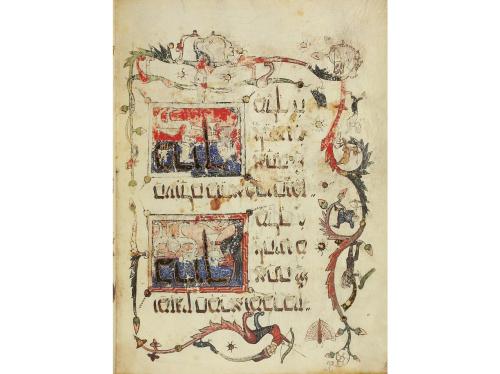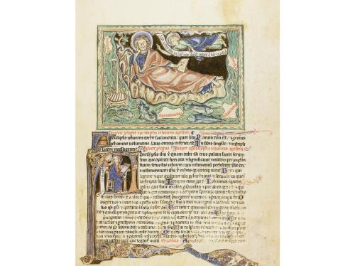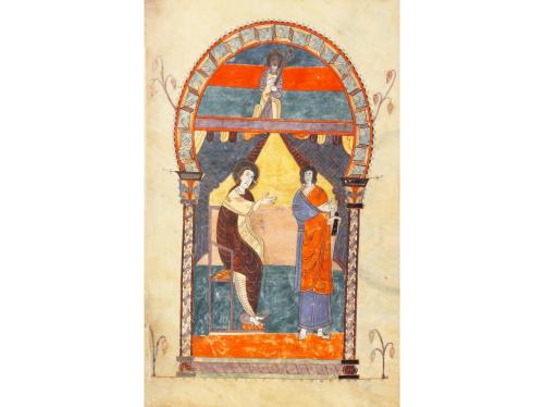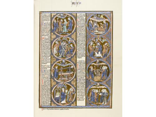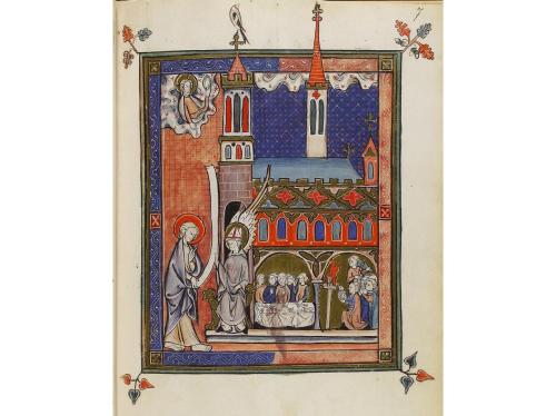 1997. LIBRO. (FACSÍMIL). BIBLIA MORALIZADA DE SAN LUIS. Madrid: Ed. Casariego, 1997. Dos vol. en Folio mayor. El facsímil contiene una reproducción de la obra en papel imitación de pergamino y está enc. en plena piel ante, con decoraciones en hierros secos en ambos planos. Edición numerada y limitada a 495 ejemplares. Con el libro de estudio, presentados ambos en una petaca de cartoné. La también llamada "Biblia Rica" de Toledo fue pensada para la formación del rey francés Luís IX. Debía tener todos los lujos que se puedan acumular en un libro. Posteriormente pasó a posesión de Alfonso X. Sabemos que se escribió entre 1226 y 1234. Actualmente se conserva en la catedral de Toledo a excepción de estas hojas.