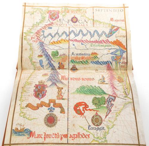 2000. LIBRO. (FACSÍMIL). ATLAS UNIVERSAL. DIOGO HOMEN. Barcelona: Moleiro Editores, 2000. Gran folio. El volumen reproduce el original que se custodia en la Biblioteca Nacional de Rusia en San Petersbrugo. Edición numerada y con acta notarial. Enc. en plena piel, hierros secos en el plano anterior, presentado en una caja de piel, pequeñas marquitas en la piel. Sin el libro de estudio.