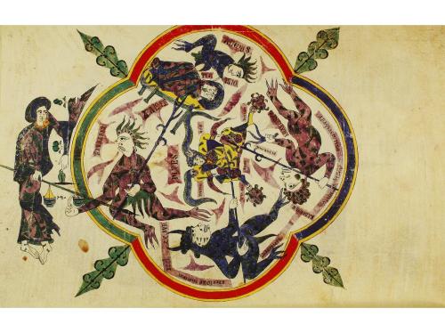 1980. LIBRO. (FACSÍMIL). APOCALIPSIS FIGURADO DE LOS DUQUES DE SABOYA. Madrid: Edilan, 1980. Folio mayor. Edición facsímil del códice escurialense Vit. I del Apocalipsis figurado de los duques de Saboya. Profus. ilustr., abundantes dorados. Enc. en plena piel, planos con hierros dorados, cortes pintados. Acompañado del libro de estudio en media piel, juntos en una petaca de cartoné con roturas. Edición numerada de 1000 ejemplares.