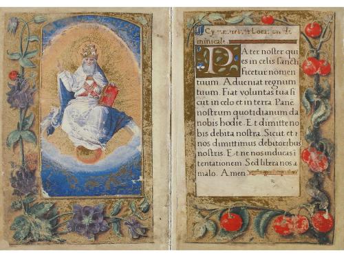 1999. LIBRO. (FACSÍMIL). FLORILEGIO DE ORACIONES DE RENATA DE FRANCIA. Madrid: Ars Millenii, 1999. 12º. 28 h. de facsímil, páginas orladas con abund. dorados. Enc. en tercipelo rosa con cierres. Edición numerada de 1000 ejemplares, este ejemplar corresponde a los 150 de la edición española. Se acompaña del libro de estudio con texto de Ernesto Milano. Presentados en estuche en piel, con marquitas de roce.