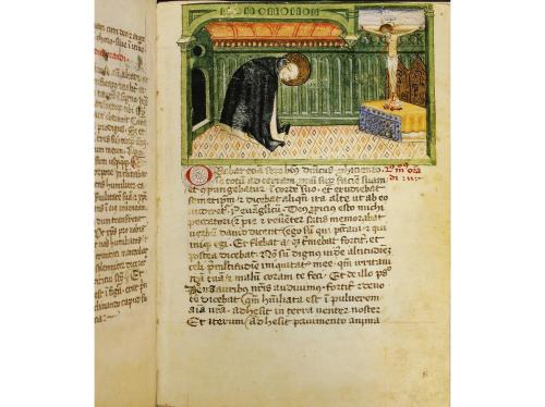 1997. LIBRO. (FACSÍMIL). MODI ORANDI SANCTI DOMINICI. Zurich: Ediciones Encuentro, 1995. 8º menor. Reproducción facsímil del manuscricto en el que se describen los gestos de oración y devoción de Santo Domingo. Se trata de un códice miniado custodiado en la Biblioteca Apostólica Vaticana. Va acompañado de 2 libros de estudio, uno en castellano y el original en alemán. El facsímil está enc. en plena piel con hierros secos en ambos planos y un faldón de piel con borla. Todo presentado en una caja en tela arpillera. Con acta notarial, edición limitada a 900 ejemplares.