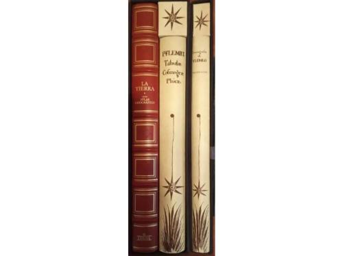 2001. LIBRO. (FACSÍMIL). COSMOGRAFIA. Barcelona: Ebrisa-Planeta, sa. 2 vol. en folio mayor. 1 vol. con el estudio y la traducción, coordinado por Manuel Cecilio Díaz y Díaz. El 2º vol. es el facsímil de el atlas, de edición numerada y limitada a 3000 ejemplares. Ambos encuadernados en cartoné y presentados en dos estuches de tela. Edición facsimilar del atlas de Claudio Ptolomeo tal y como salió de la imprenta de Johannes Reger en 1486 y que actualmente de conserva en la Universidad Complutense. Ptolomeo, astrónomo, matemático y geógrafo griego que vivió en el siglo II de nuestra era, y que nos ofrece una completa síntesis de la astronomía clásica griega. [Más:] LA TIERRA. GRAN ATLAS GEOGRÁFICO. Fran folio. Enc. en piel con hierros secos en el plano anterior.