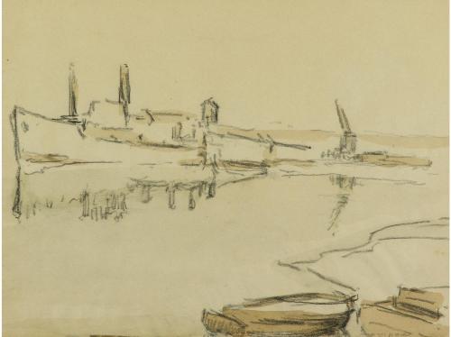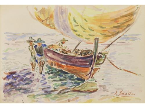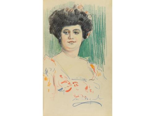 1894-1910 ca. ORIGINAL ARTÍSTICO. (LIBRO FIRMAS-MADRID). LIBRO DE DEDICATORIAS Y FIRMAS QUE CONTIENE TAMBIÉN DIBUJOS, TODOS DIRIGIDOS A MATILDE. Libro de firmas en 4º menor apaisado, enc. en plena piel, con hilos dorados, cantos y cejas. Cajos completamente sesgados. Contiene firmas y dedicatorias de personajes de la alta sociedad madrileña, comienza con una firma de Alfonso XIII y siguen escritores, políticos y artistas como: la Condesa de Pardo Bazán, Benito Pérez Galdós, Azorín, Fernando Díaz de Mendoza, José Echegaray, Mariano Montoliu y de Rocabruna, Palacio Valdés, Pablo Font y Rubinat, Juan Valera, Miguel Moya, José Ortega Munilla, Manuel Tolosa Latour, Jacinto Benavente, Manuel J. Caballero, M. Menéndez y Pelayo etc. Contiene también una pequeña partitura intitulada "polka de la muñequita" y firmada por el maestro R. Chapí. Pero el volumen contiene además varios dibujos originales de grandes artistas, que con las pinturas, acuarelas o lápices que les proporcionaron en el momento, improvisaron una pequeña obra única. Destacamos entre ellos un dibujo a tinta y lápices de colores firmado por Juan Serra, otro firmado por José Moreno Carbonero, un dibujo a lápiz firmado por A. Ferrant, una acuarela de Venecia firmada por Pradilla, un dibujo a tinta firmado por Emilio Sala y una marina a la acuarela que, aunque en la firma reza Sorolla, no es del artista (se trata de su pintura más copiada). Para completar el álbum dos dedicatorias llevan unos versos de sus autores, una va firmada por el Conde de Cheste y la segunda escrita en catalán y firmada por Santiago Rusiñol.