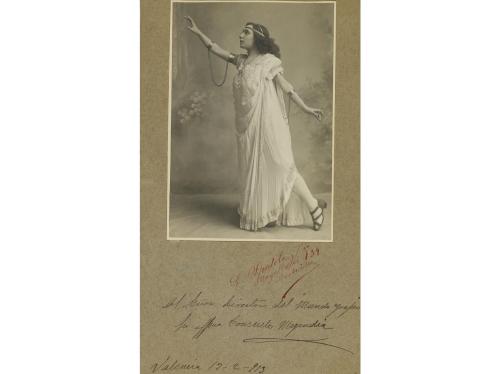 1908. ORIGINAL ARTÍSTICO. (LIBRO DEDICATORIA). LIBRO HOMENAJE A LUISA MOSCAT. Volumen en 8º mayor, enc. en tafilete rojo, hilos dorados en ambos planos, cejas, cortes dorados; en el plano anterior lleva una placa de plata que reza: "1908. A LUISA MOSCAT -LA PRENSA DE LA HABANA-". Todo el libro dedicado a la artista, que triunfó en la Habana como cantante y actriz en el teatro de zarzuelas. Debutó en 1907 en el teatro Albisu, y desde esa primera obra su éxito fue enorme. Sólo un año después le dedican este álbum todos los críticos de la época que hablaron de ella en sus diarios y revistas, exaltando su arte. Comienza el álbum con un bello retrato de estilo modernista firmado por M. Miguel, que más adelante también le dedica una caricatura. Contiene largas dedicatorias firmadas por críticos como Francisco Hermida (de "la Discusión"), J. Gil del Real ("Diario de la Marina"), Eduardo Alonso (de la revista teatral "el Mundo"), Justo Martínez ("The Havana Post"), Luis G. Costi ("La unión Española"), Manrique ("el comercio"), Polo (de "el liberal") y otros muchos críticos de los mismos diarios y revistas. Todos en alabanza de la artista y la persona. Sólo ha transcurrido un año desde el debut de la cantante y el gran impacto que ha causado impulsa esta obra. Además de las dedicatorias se incluye en el álbum un goucache firmado por M. Arias, un dibujo a lápiz firmado por Quiñones y dos acuarelas firmadas en Manila en 1914 por Ramón Peralta. Incluye también dos partituras manuscritas realizadas por los músicos Jorge Anckerman y Rafael Pastor.