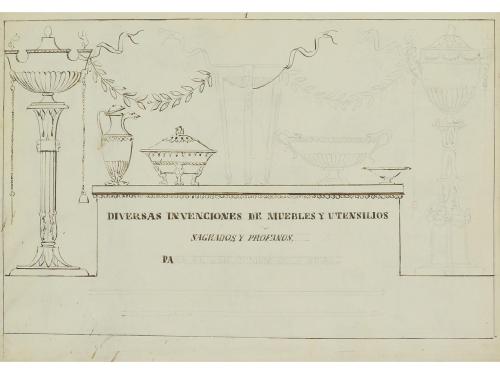 1847. ORIGINAL ARTÍSTICO. (ARTE-MUEBLE). MUEBLES Y UTENSILIOS ANTIGUOS Y MODERNOS. ADORNOS VARIOS- 1847/ DIVERSAS INVENCIONES DE MUEBLES Y UTENSILOS SAGRADOS Y PROFANOS PARA EL USO COMUN DE LA VIDA. Cartilla en 8º apaisado sobre papel verjurado con filigrana "Manuel". 36 fol. numerados pero dibujados hasta el folio 31 (aunque el fol. 25 en blanco y el 26 ausente). Diseños de adornos y muebles en tinta y grafito de mano del pintor aragonés. Está inacabado, en el interior el título está incompleto y la mayoría de los diseños sólo llevan el apunte a lápiz. Hernández Latas, Bernardino Montañés (1825-1893), 2002.