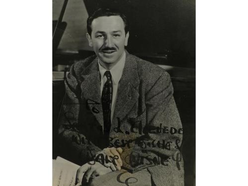 1945 ca. FOTOGRAFÍA. WALT DISNEY. Cuatro fotografías, de 23 x 18 cm aprox., del dibujante y productor. En una de ellas hay una dedicatoria, impresa en la imagen. En las otras tres hay sellos de prensa al dorso.