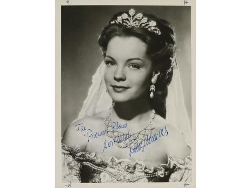 1955. FOTOGRAFÍA. (DEDICATORIA-ACTRIZ). ROMY SCHNEIDER, CON DEDICATORIA Y FIRMA. Fotografía de 24 x 18 cm, con anotaciones y sello de caucho al dorso. Caracterizada para Sissi emperatriz.