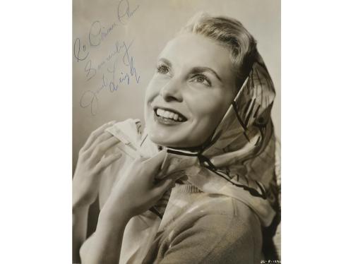 1951. FOTOGRAFÍA. (ACTRIZ- FIRMADA). JANET LEIGH, CON DEDICATORIA Y FIRMA. Imagen de 23,5 x 19 cm, con anotaciones al dorso, sello de caucho de prensa y pie de página mecanografiado y sobrepuesto. La actriz ganó un globo de oro por su papel en Psicosis.