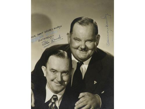 1949. FOTOGRAFÍA. DOS FOTOGRAFÍAS DE LOS ACTORES STAN LAUREL Y OLIVER HARDY. Imágenes de 23 x 18 cm, una sobre gelatina de plata con las decicatorias de los artistas, el nombre de a quién va dirigida la dedicatoria está tachado.