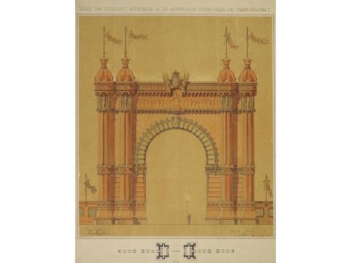 1887. ORIGINAL ARTÍSTICO. (ARQUITECTURA). ARCO DE TRIUNFO: ENTRADA A LA EXPOSICION UNIVERSAL DE BARCELONA. Dibujo original en tinta y coloreado a la acuarela, de 37 x 32 cm, sobrepuesto en una cartulina con título en la parte superior y dibujo de la planta del arco, a mano, en la inferior (escala 1:400). Va firmado el dibujo por el arquitecto Elias Rogent (director de las obras de la exposición universal de Barcelona) y Josep Vilaseca (arquitecto de la obra).