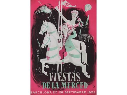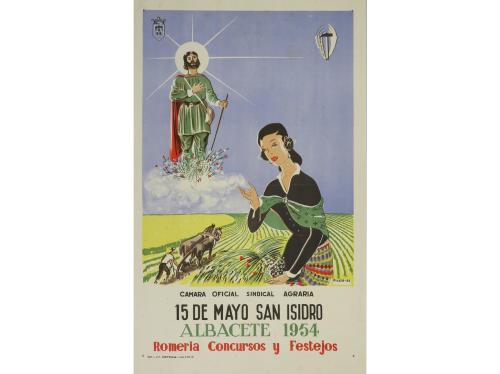 1954. CARTEL. CAMARA OFICIAL SINDICAL AGRARIA. 15 DE MAYO, SAN ISIDRO. ALBACETE 1954. ROMERIA CONCURSOS Y FESTEJOS. Valencia: Imp. Lit. Ortega, 1954. 49 x 30,5 cm. Entelado. Antigua marca de doblez. A- .