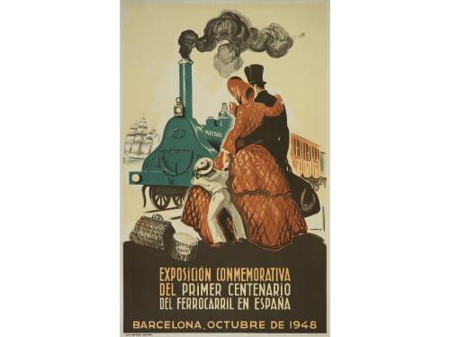 1948. CARTEL. EXPOSICION CONMEMORATIVA DEL PRIMER CENTENARIO DEL FERROCARRIL EN ESPAÑA. MORELL. 1948. 48 x 30 cm (19 x 12 in). Litografía. Entelado. A.