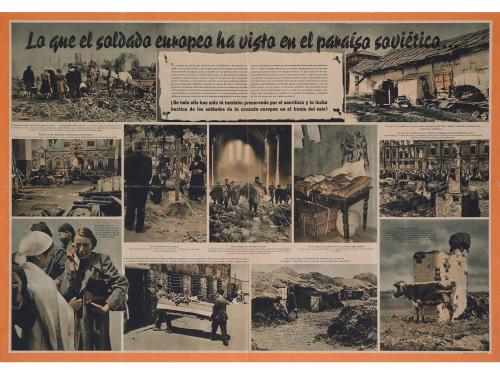 1942. CARTEL. (PROPAGANDA). LO QUE EL SOLDADO EUROPEO HA VISTO EN EL PARAÍSO SOVIÉTICO. Cartel de mosaico fotográfico en offset. 61 x 86 cm. Propaganda contra la Unión Soviética, en castellano.