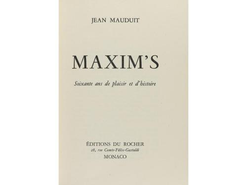 1958. LIBRO. (COCINA-ENCUADERNACIÓN). MAXIM'S. SOIXANTE ANS DE PLAISIR ET D'HISTOIRE. Monaco: Ed. du Rocher, 1958. 8º. 349 p. + 1 h. Con ilustraciones a color y fotografías en b/n, fuera del texto. Enc. por MIQUELRIUS en pleno pergamino rígido, hilos dorados, cejas, nervios, tejuelo, lomera cuajada, cortes dorados, conserva las cubiertas y lomera originales.