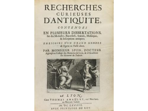 1683. LIBRO. (ARTE). RECHERCHES CURIEUSES D'ANTIQUITE, CONTENUES EN PLUSIEURS DISSERTATIONS SUR DES MEDAILLES, BAS-RELIEFS, STATUËS... Lyon: chez Thomas Amaulry, 1683. 4º menor. 12 h. incluido frontis grabado por R. M. Ogier + 538 p. + 11 h. Profus. ilustr. con grabados calcográficos en el texo. Enc. en pergamino reciente, lomera rotulada, cortes pintados, se han conservado dos ex-libris de antiguos propietarios, uno de ellos de Helen H. Tanzer, investigadora y docente de arqueología romana.