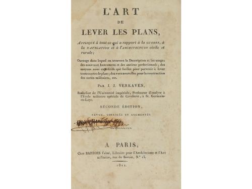 1811. LIBRO. (ARQUITECTURA-PLANOS). L'ART DE LEVER LES PLANS, APPLIQUÉ À TOUT CE QUI A RAPPORT À LA GUERRE, À LA NAVIGATION ET À L'ARCHITECTURE CIVILE ET RURALE. Paris: Chez Barrois, 1811. 8º mayor. 16 p. + 323 p. + 1 estado plegado y 9 lám. grabadas plegadas. Algún leve cerco de humedad y moteado ocasional de óxido, tachadura en la portada. Enc. en pasta española, tejuelo, cortes pintados, planos rozados.