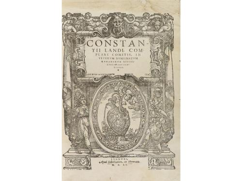 1560. LIBRO. (NUMISMÁTICA). COMPLANI COMITIS, IN VETERUM NUMISMATUM ROMANORUM MISCELANEA EXPLICATIONES. Lugduni: Apud Sebastianum de Honoratius, 1560. 4º menor. 4 h. + 148 p. + 1 h. Portada con grabado xilográfico. Capitales decoradas con motivos florales. Cerco de humedad en la esquina de toda la obra. Ligero moteado de óxido. Enc. en pergamino reciente, lomera rotulada.