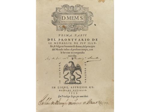 1553. LIBRO. (NUMISMÁTICA). PRIMA PARTE DEL PRONTUARIO DE LE MEDAGLIE DE PIU ILLUSTRI, & FULGENCI HUOMINI & DONNE, DAL PRINCIPIO DEL MONDO INSINO AL PRESENTE TEMPO. In Lione: Apresso Guglielmo Rovillio, 1553. 4º menor. 4 h. + 247 p. + 4 h. Ilusr. con grabados en el texto, portada con grabado tipográfico. Ligero moteado de óxido, algún pliego algo oscurecido. Enc. en pergamino de época.