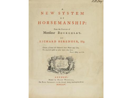 1754. LIBRO. (EQUITACIÓN). A NEW SYSTEM OF HORSEMANSHIP: FROM THE FRENCH OF MONSIEUR BOURGELAT. London: Printed by Henry Woodfall, 1754. 4º mayor. Frontis grabado por G. Bickham y dibujado por J. Seymer + Portada a dos tintas + 147 p. Buen papel verjurado, amplios márgenes. Enc en plena piel, planos rozados, nervios, tejuelo, lomera restaurada, cortes pintados.