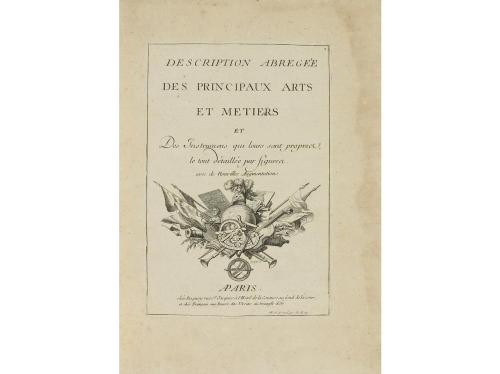 1715 ca. LIBRO. (ARTE). DESCRIPTION ABREGÉE DES PRINCIPAUX ARTS ET METIERS ET DES INSTRUMENS QUI LEURS SONT PROPRES LE TOUT DÉTAILLÉE PAR FIGURES AVEC DE NOUVELLES AUGMENTATIONS. Paris: Chez Baquoy, 1700 ca. 4º mayor. 143 planchas, incluidas las h. de texto. Los grabados reproducen detalladamente las herramientas, los espacios y las estructuras de los oficios tradicionales. Enc. en pasta española, nervios, cortes pintados, tejuelo.