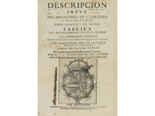 1657. LIBRO. (ARQUITECTURA). DESCRIPCION BREVE DEL MONASTERIO DE S. LORENZO EL REAL DEL ESCORIAL. UNICA MARAVILLA DEL MUNDO. FABRICA DEL PRUDENTISSIMO REY PHILIPPO SEGUNDO (...) CON LA MAGESTUOSA OBRA DE LA CAPILLA INSIGNE DEL PA. Madrid: en la Imprenta Real, 1657. 4º mayor. 6 h. (inclusive portada con escudo real grabado al cobre) + 184 fol.+ 4 h. + 1 h. Retrato de Felipe IV, firmado en plancha "Petrus de Villafranca Sculptor Regius delineavit et sculpsit, Matriti, 1657". 10 láminas, 9 a doble página, todas grabadas al cobre por el mismo artista y una de ellas fechada en 1654. Ex-libris manuscrito tachado en la portada. Alguna sombra de óxido. Encuadernación original de la época en plena piel, cortes pintados, planos rozados. CCPB 42842-6. Palau 300550. Primera edición.