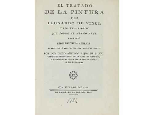 1784. LIBRO. (ARTE-PINTURA). EL TRATADO DE LA PINTURA DE... Y LOS TRES LIBROS QUE SOBRE EL MISMO ARTE ESCRIBIÓ LEON BAUTISTA ALBERTI. Trad. Diego Antonio Rejón de Silva. Madrid: Imp. Real, 1784. 4º menor. Frontis grabado + 7 h. + Retrato grabado de L. da Vinci + XVIII + 266 p. + 40 láminas grabadas (incluido retrato de Alberti). Óxido ocasional y leve. Enc. en pasta española, tejuelos, nervios, hierros secos en ambos planos, algo rozado. Palau 369698. CCPB 166370-4. Aunque da Vinci nunca llegó a publicar su tratado de pintura como pretendía, su discípulo Francesco Melzi lo dio a conocer a mediados del s. XVI. Esta es la primera edición española.