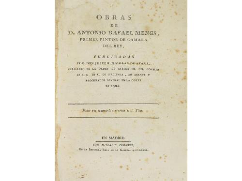 1780. LIBRO. (ARTE). OBRAS DE D. ANTONIO RAFAEL MENGS, PRIMER PINTOR DE CAMARA DE REY. Madrid: Imp. real de la Gazeta, 1780. 4º. Retrato facsímil + 6 h. + L + 404 p. Buen papel de hilo, blanco y marginoso, leves puntos de óxido en la portada. Enc. en media piel y puntas. No en Palau. Primera edición. CCPB 60753-3 .