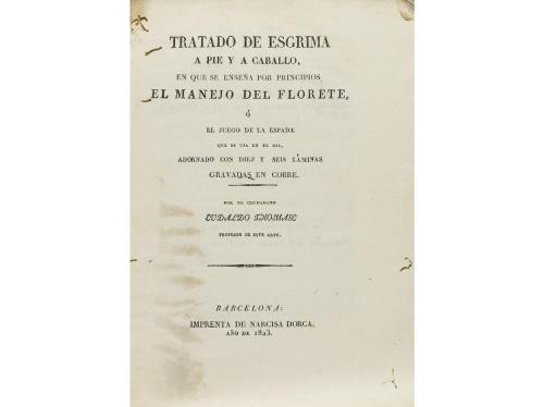 1823. LIBRO. (ESGRIMA). TRATADO DE ESGRIMA A PIE Y CABALLO, EN QUE SE ENSEÑA POR PRINCIPIOS EL MANEJO DEL FLORETE, Ó EL JUEGO DE LA ESPADA QUE SE USA EN EL DIA ADORNADO CON DIEZ Y SEIS LAMINAS GRAVADAS EN COBRE. Barcelona: Imp. Narcisa Dorca, 1823. 8º mayor. 71 p. Sin las láminas. Falsas cubiertas de papel, finas galerías en el margen interior.
