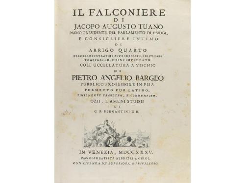 1735. LIBRO. (CETRERÍA). IL FALCONIERE DI... COLL'UCELLATURA A VISCHIO DI PIETRO ANGELIO BARGEO... Venezia: Giambatista Albrizzi q. Girol, 1735. 4º. 20 h. (incluido grontis grabado)+ un retrato dibujado por A. David y grabado por R. Pozzi + 223 p. Cabeceras grabadas con escenas de caza y culs-de-lampe alegóricos + 50 p. + 9 h. Dos obras juntas, a dos columnas con el texto paralelo en italiano y latín. Ligera señal de óxido. Enc. en pasta española, nervios, ligeramente rozada. Primera edición italiana, publicada en Burdeos por primera vez en 1582.