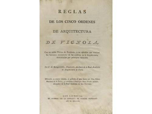 1792. LIBRO. (ARQUITECTURA-ARTE). REGLAS DE LOS CINCO ÓRDENES DE ARQUITECTURA. Madrid: Imp. Manuel Gonzalez, 1792. 4º mayor. Frontis grabado + 3 h. + 21 p. + 44 lám. + 2 h. + de p. 27 a 42 p. (APÉNDICE) + 21 lám. Prof. ilustr. con grabados al aguafuerte y buril dibujados y grabados por Fausto Martínez de la Torre y Joseph Asensio. Ejemplar con cerco de humedad sucio, en toda la obra. Enc. en piel, rozada, conserva parte del tejuelo. Palau 364898.