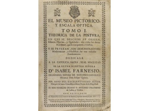 1715. LIBRO. (ARTE). EL MUSEO PICTORICO, Y ESCALA OPTICA. TOMO I. THEORICA DE LA PINTURA EN QUE SE DESCRIBE SU ORIGEN, ESSENCIA, ESPECIES, Y QUALIDADES, CON TODOS LOS DEMÀS ACCIDENTES, QUE LA ENRIQUEZEN, È ILUSTRAN. TOMO. Madrid: Lucas Antonio de Bedmar, 1715. 4º mayor. Folio. 17 h.+ 306 p.+ 23 hojas y 4 láms. y frontispicio grabados al cobre. Texto con apostillas marginales, portada en orla xilográfica, cabeceras, capitales y culs-de-lampe xilografiadas. Frontispicio remontado y con pérdida en una esquina y muy leve en el margen. Papel algo oscurecido. Enc. en media piel, nervios. Primera edición. Palau 210727.