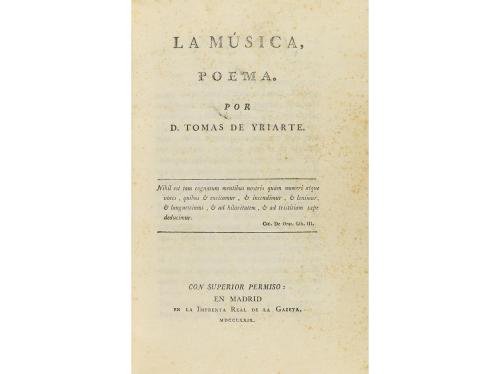 1779. LIBRO. (MÚSICA-ENCUADERNACIÓN). LA MÚSICA, POEMA. Madrid: Imp. Real de la Gazeta, 1779. 4º menor. 10 h. + 126 p. + XL p. + 1 h. Ilustr. con 6 lám. dibujadas por G. Ferro y grabadas por M. S. Carmona. Enc. firmada por MIQUELRIUS en plena piel, ruedas doradas en ambos planos, cantos y cejas, cortes dorados, con una camisa de tela. Señal de óxido muy puntual, en general limpio. PRIMERA EDICIÓN de este poema dividido en cinco cantos, un verdadero ensayo sobre la música y su uso en la sociedad. CCPB 60745-2. Palau 121147.