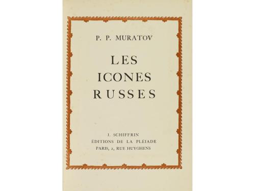 1927. LIBRO. (ARTE-ENCUADERNACIÓN). LES ICONES RUSSES. París: J. Schiffrin. Éditions de la pléiade, 1927. 4º mayor. 254 p., 5 h. Ilustrado con 4 láminas en color sobrepuestas y 56 láminas b/n, fuera de texto. Puntos de óxido. Muy bonita enc. firmada por BALMES en plena piel, con hierros decorativos en ambos planos, nervios, lomera decorada, cantos y cejas, corte superior dorado.