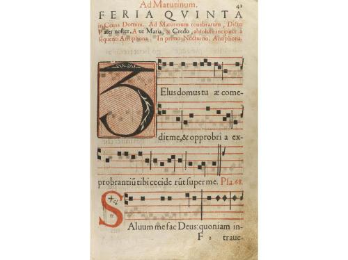 1515 ca. LIBRO. (MÚSICA-ARTE). GRADUAL ROMANO. PASIONARIO. [Firenze: impensa Petri Pauli et Galeazij de Porris]. Dos partes enc. en un vol. en folio mayor. Ambas partes han perdido la portada. I: de fol. 2 a 234. II: de fol. 2 a 121 (faltan fol. al final). En la primera parte faltan los folios 1, 4-13, 35, 40, 67 y 76. En la seguna parte faltan los folios 1, 64, 65, y la parte inferior del fol. 118, además de los folios finales a partir del 122. Notación cuadrada en negro sobre pentagrama en rojo, capitales xilográficas historiadas de Porro Pietro Paolo y otras capitales xilográficas decoradas con filigranas. Texto a dos tintas. Contiene los cantos y textos de Semana Santa correspondientes a la Pascua (primera parte) y Pasión (según cada evangelio). Antiguos cercos de humedad, algún ocasional moteado de óxido y suciedad en la esquina inferior de los folios, por su mucho uso. Alguna rasgadura marginal, en algún caso pérdida de papel en esquina. Enc. en piel sobre tabla, hierros secos en ambos planos, nervios, restos de cierres metálicos y faltas de piel en plano anterior y lomera. Pasionario que contiene todos los cantos de la Semana Santa, desde la entrada en Jerusalem hasta la resurrección. Bellamente decordado con capitales xilográficas de Porro Pietro Paolo, problamente en los folios que faltan habría xilografías de mayor tamaño, incluidas las portadas.
