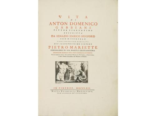 1762. LIBRO. (ARTE). VITA DI ANTON DOMENICO GABBIANI, PITTOR FIORENTINO. Firenze: Nella Stamperia Moückiana, 1762. Gran folio. XI p. + retrato grabado del pintor + 72 p. + 11 p. + 100 grabados sobre pinturas, dibujos, etc., de Gabbiani, realizados por diferentes grabadores. Texto con apostillas marginales. Gran papel, amplios márgenes. Enc. en media piel, nervios, planos de cartoné papel al agua, algo rozada.