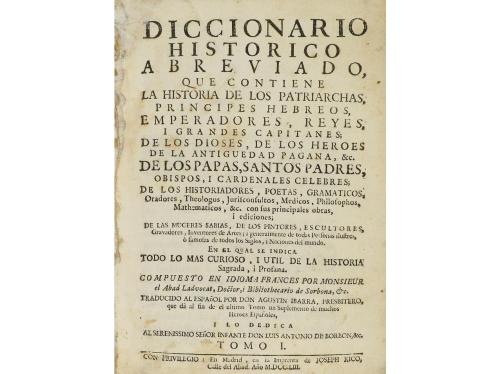 1753-1754. LIBRO. (BIBLIOGRAFÍA). DICCIONARIO HISTORICO ABREVIADO, QUE CONTIENE LA HISTORIA DE LOS PATRIARCHAS, PRINCIPES HEBREOS, EMPERADORES, REYES, I GRANDES CAPITANES; DE LOS DIOSES, DE LOS HEROES DE LA ANTIGUEDAD PAGANA &. DE LOS. Madrid: Imp. Joseph Rico, 1753-1754. 5 vol. en 8º mayor. I: 10 h. + 398 p. II: 2 h. + 357 p., con anotaciones manuscritas en las guardas volantes. III: 2 h. + 463 p. IV: 2 h. + 415 p. V: 2 h. + 446 p. Texto a dos columnas, algún cerco ocasional de humedad y marcas de lápiz en alguna hoja de guardas. Enc. en pergamino de época, lomeras rotuladas. Palau 129556.