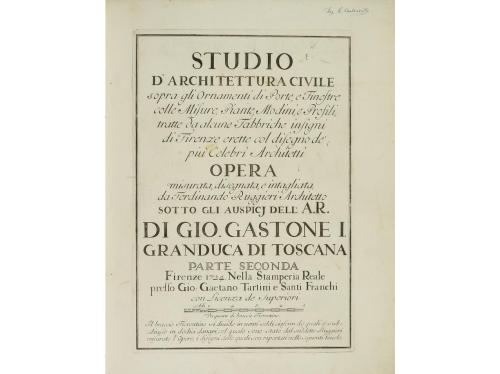 1724. LIBRO. (ARQUITECTURA). STUDIO D'ARCHITETTURA CIVILE SOPRA GLI ORNAMENTI DI PORTE, E FINESTRE COLLE MISURE, PIANTE, MODINI, E PROFILI, TRATTE DA ALCUNE FABBRICHE INSIGNI DI FIRENZE ERETTE COL DISEGNO DE PIU CELEBRI ARCHITETT. Firenze: Nella Stamperia Reale presso Gio. Gaetano Tartini e Santi Franchi, 1724. Gran folio. Frontis grabado + portada + 3 h. + 80 lám. calcográficas grabadas. Preciosa impresión sobre papel de gran calidad, grueso, en papel de hilo. Enc. de época en plena piel, hierros secos en ambos planos, muy rozada, cajos completamente sesgados. Este volumen dedicado a la obra de Michelangelo de las tumbas de los Medici. Es el segundo volumen de tres.