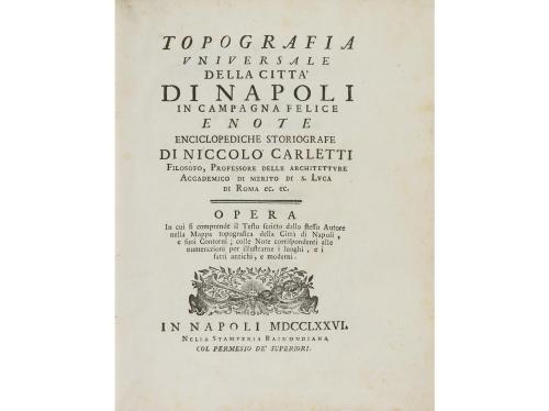 1776. LIBRO. (ARQUITECTURA). TOPOGRAFIA UNIVERSALE DELLA DITTA' DI NAPOLI IN CAMPAGNA FELICE E NOTE ENCICLOPEDICHE. Napoli: Nella Stamperia Raimondiana, 1776. 4º menor. XXXV p. + 2 h. + 372 p. y 2 lám. plegadas. Una es una vista de la ciudad de Nápoles y la segunda un plano topográfico de la misma. Cabeceras y capitales xilográficas. Muy leve óxido marginal. Enc. en pergamino de época, algo mareado, tejuelo. PRIMERA EDICIÓN.