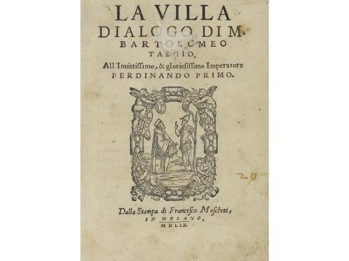 1559. LIBRO. (ARTE-JARDINES). LA VILLA DIALOGO DIM. Melano: Dalla Stampa di Francesco Moscheni, 1559. 8º menor. 11 h. + 181 p. + 2 h. Capitales xilográficas. Ilustr. con un grabado en la portada y xilografías en el texto. Corto de margen superior, pequeña restauración en la portada. Enc. en cartoné, algo abierta, cortes pintados. PRIMERA EDICIÓN y única, de este texto sobre arquitectura de los jardines), basado en la vida contemplativa de Cicerón y en Plinio el Joven, a la vez que el espíritu ordenado y harmonioso del renacimiento estructura el discurso. No son frecuentes los textos renacentistas sobre la arquitectura de jardines, este es uno de los principales referentes.