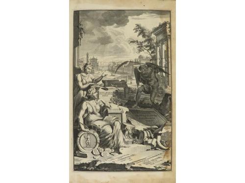 1696. LIBRO. (ROMA-ARQUITECTURA). THESAURUS ANTIQUITATUM ROMANARUM. Sólo tomos III y IV. Lugd. Batavor.: Apud Franciscum Halmam & Petrum Vander Aa, 1696. 2 vol. en folio mayor. Tomus Tertius: 8 h. (incluido frontis grabado) + 874 col. + 37 h. de índices y 45 lám. grabadas, de las que 5 son plegadas. Con grabados en el texto. Capitales y duls-de-lampe. Portada a dos tintas. Tomus quartus: 14 h. (sin la portada) + de col. 877 a 1954. Y cinco lám. grabadas, plegadas. [Sigue:] 1 h. + 24 p. + XX lám. + 21 h. Capitales y culs-de-lampe. Dos vol. enc. en pasta española, con peladuras en los planos, cantos rozados, doble tejuelo, nervios, lomeras cuajadas, cajos rozados y cabezadas débiles.